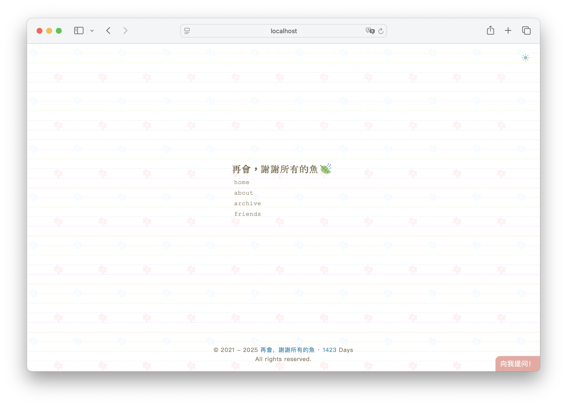 改动不是非常大,因为即将入秋所以换了换一下配色,还挺萌的吧!这个博客的主题代码写得非常乱,每次改改CSS哪怕只是配色也可说是牵一发而动全身。导致我都在想要不要重新建一个主题文件夹了。